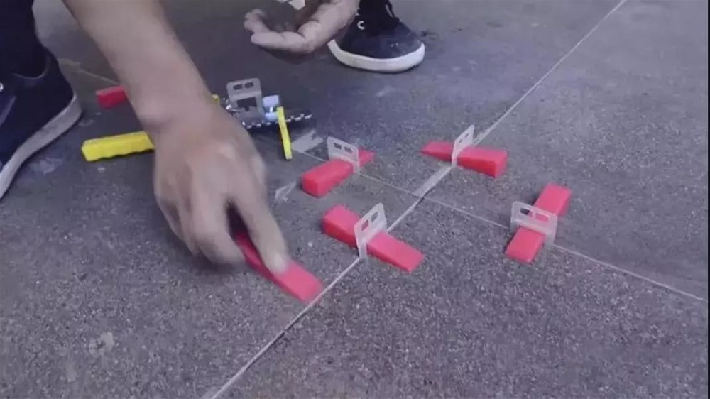 將瓷磚平整地鋪貼在基層上,使用橡膠錘將瓷磚拍實(shí)鋪平,便于排出氣泡,輕敲磚面,讓磚底能全面吃漿,以免產(chǎn)生空鼓現(xiàn)象。用木錘把磚面敲平整的同時(shí),以靠尺測(cè)量,確保瓷磚鋪貼水平。