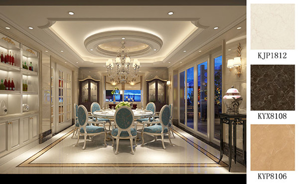整個空間以淺色調(diào)為主,餐椅的一抹淺藍實現(xiàn)了整個空間色調(diào)的跳躍,更具韻味。地面主要鋪貼金剛釉瓷磚水晶玫瑰KJP1812、搭配大理石瓷磚金王啡KYX8108、大理石瓷磚金世紀(jì)米黃KYP8106,與整體格調(diào)相輔相成,自然舒適。天花造型方中有圓,精美的水晶吊燈鑲嵌其中,奢華大氣,雍容華貴!
