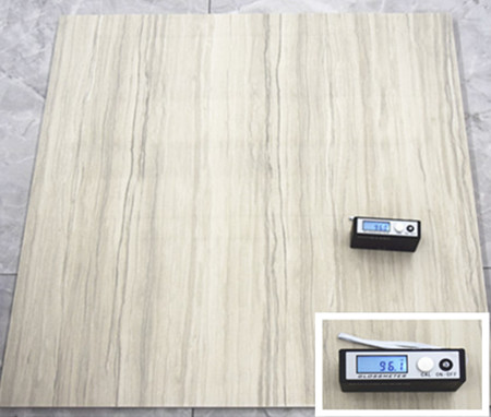 測評瓷磚必不可少的一項環(huán)節(jié)就是光澤度的測試,測評人員使用專業(yè)的光澤度儀,在瓷磚表面移動不同的位置測試,最后結(jié)果為多個位置光澤度的平均值。測試結(jié)果為96.1度,光澤度可以說是讓人意想不到的好。