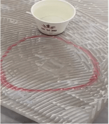 為了檢測這款瓷磚是否夠防滑,測評人員將瓷磚傾斜放置,并在瓷磚表面灑滿水,并將裝滿水的紙杯放置在瓷磚表面,靜候幾分鐘,紙杯在瓷磚表面并沒有出現(xiàn)滑行現(xiàn)象,說明這款瓷磚的防滑性能極好。