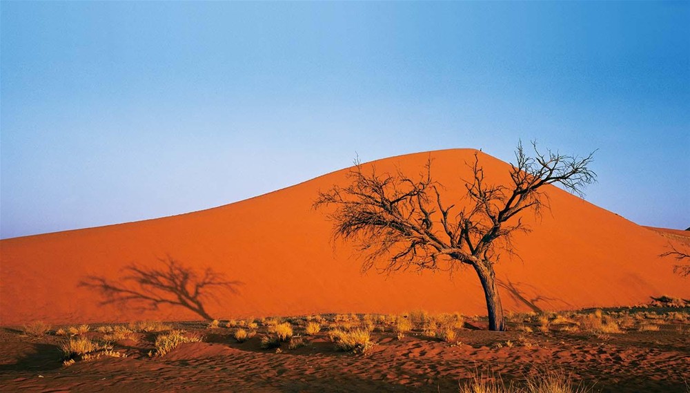 納米布沙漠是世界上最古老的沙漠之一,而且是唯一的一個紅色沙漠。它被一條干涸的河道分為南北兩個部分,北部以礫石平原為主,南部則主要是連綿的大沙丘,有的地方高達200米。“納米布”在當地的語言里,意思是“什么也沒有的地方”,但在我看來,這里不僅有,而且還很多;最多的,就是美!