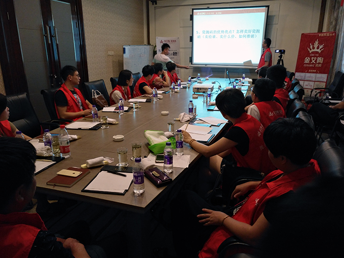 金艾陶瓷磚先后推出9面通體大理石瓷磚、阿瑪羅尼仿古磚、瓷拋磚系列等新品。本次培訓結合產品賣點、產品紋理、適合空間風格,引導銷售人員深層挖掘產品特質,通過現場互動體驗產品賣點、感受產品應用效果,學員們采用團隊PK賽制進行良性競爭學習。學員們分組進行實戰演練店內顧客接待成交,彼此間分享如何通過一言一行來感染調動消費者購買的心弦,將專業術語轉變成自己的話術,更好的傳達給終端消費者。