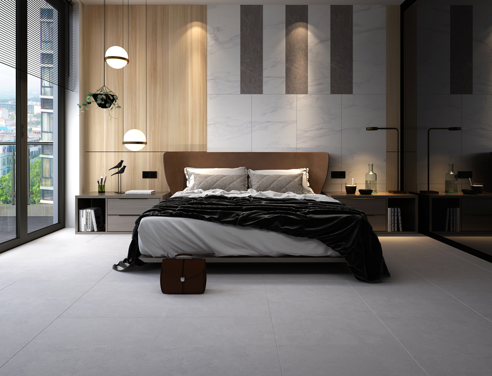 (15°緞光釉KFD8808)主臥室依然延續(xù)冷淡的灰色基調(diào),以簡潔舒適為主,營造出安靜舒心的睡眠環(huán)境。
