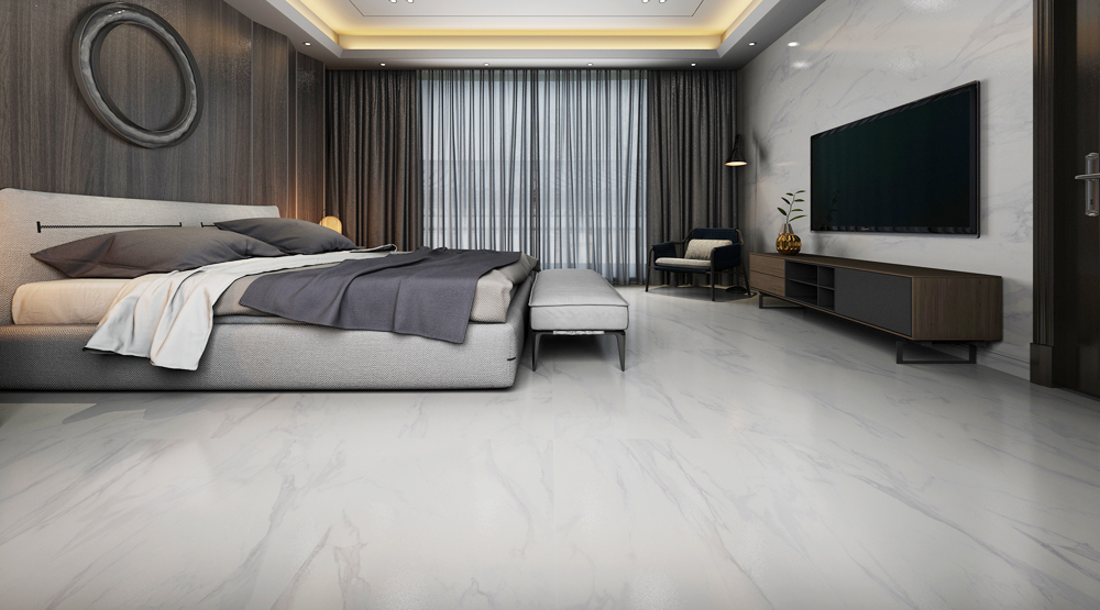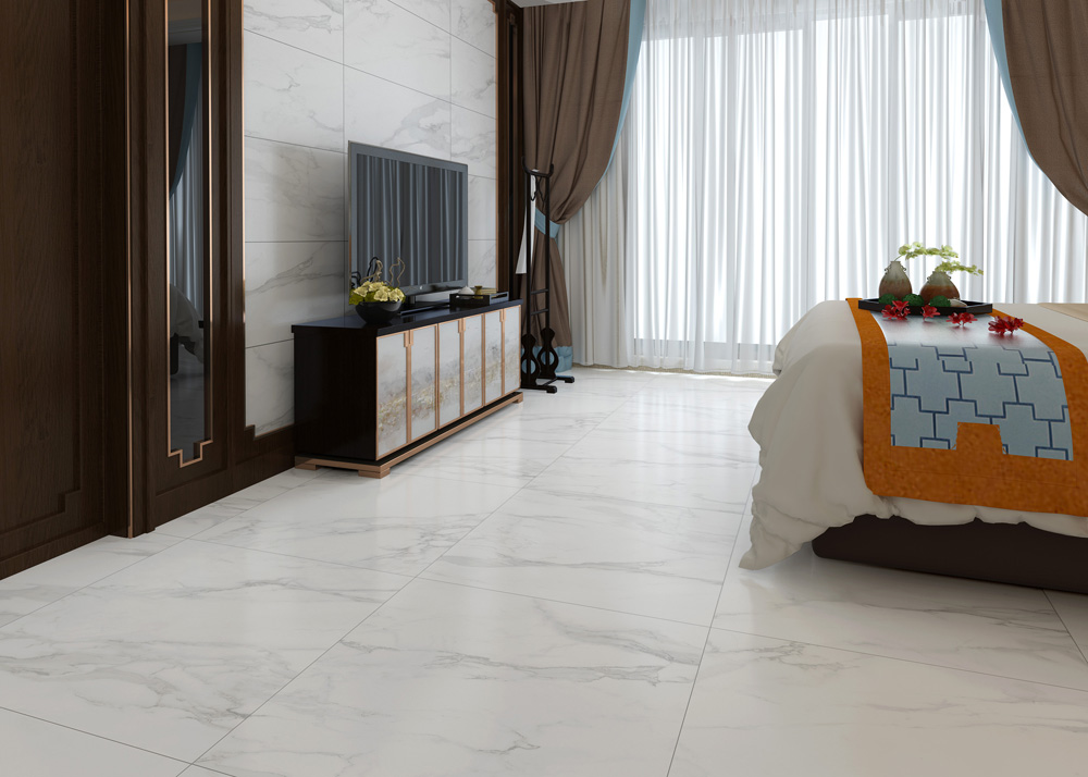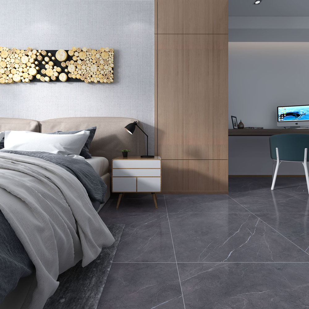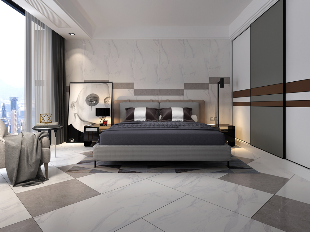 (15°緞光釉KFD126A01)錯位鋪貼的鋪磚方式,凸顯空間層次感,床尾配有布藝沙發(fā),在窗邊看著這城市的日落和日出,一天都不會覺得枯燥。